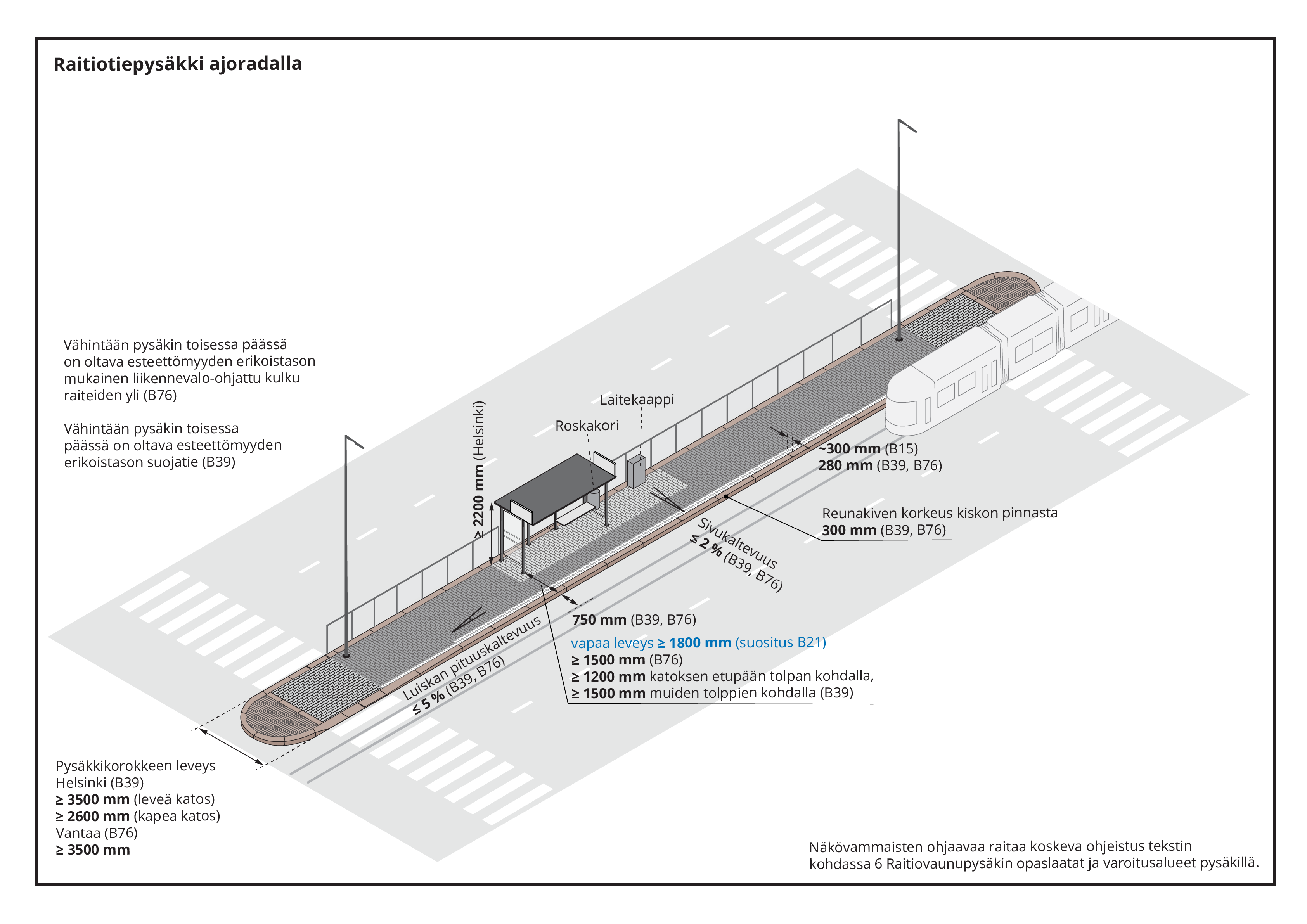 - Raitiovaunujen ja bussien yhteiskäyttöpysäkit, joilla on yhteinen palvelualue, eivät täytä esteettömyysvaatimuksia ja niiden käyttöä tulisi välttää. (B95, B96)